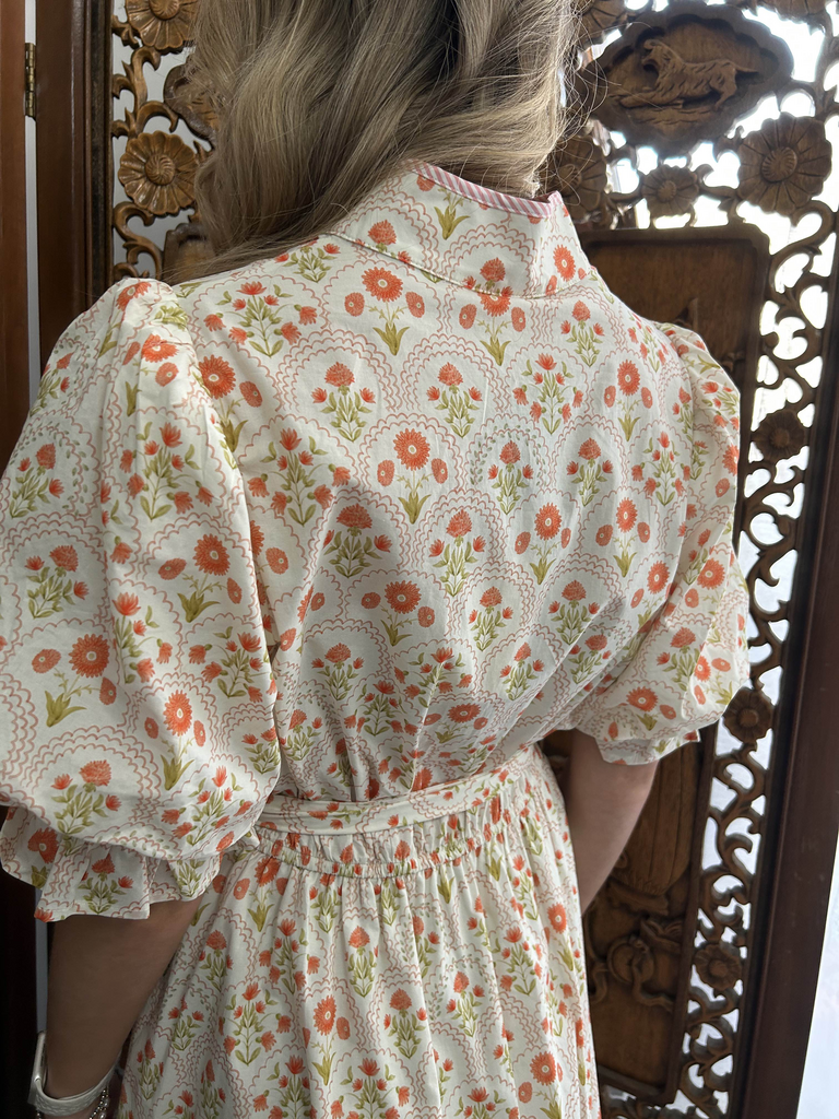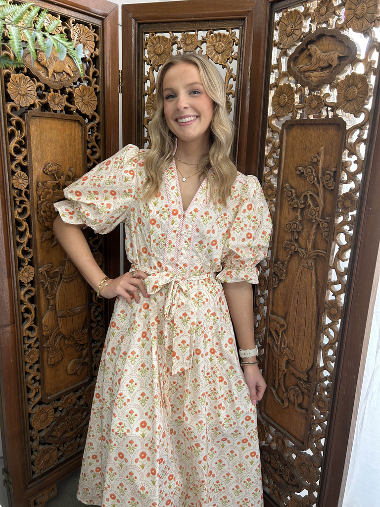 Three Button V-Neck midi with a contrast hem... tie waist belt, puff sleeves. Lined, lightweight, woven, and so cute!